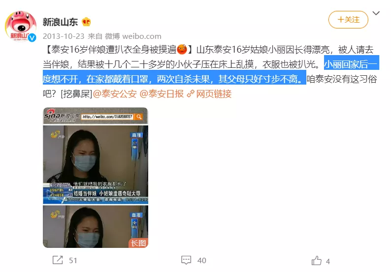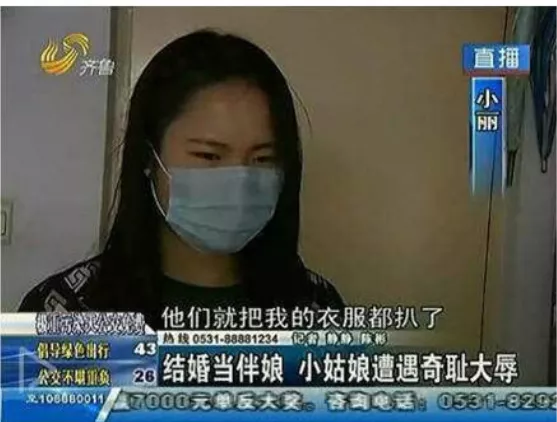 2013年,山東泰安,16歲的小麗被請去當伴娘,卻被上下其手,脱光衣服,摸遍全身。
