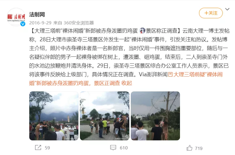 2016年9月,雲南大理,幾乎全裸新郎官與疑似伴郎的男子被捆綁在樹上,被潑墨、砸雞蛋。