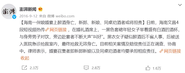 2016年,伴娘被強行勸酒,婚宴上醉酒身亡。