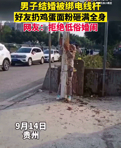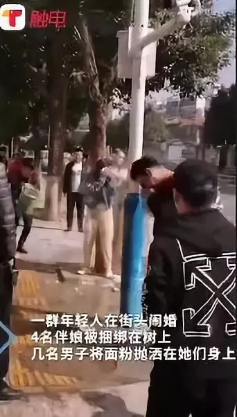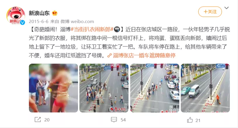 2015年6月,山東淄博,新郎官被脱得只剩內褲,被綁在信號燈杆上,遭受雞蛋、蛋糕的投擲打擊,道路一地垃圾,交通通行不便。