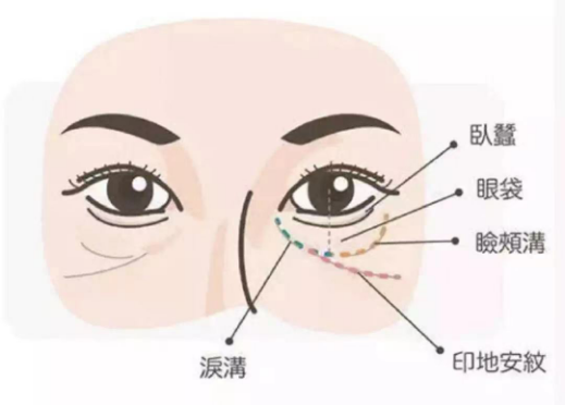 狹義的淚溝指瞳孔中線內側的沿眶下緣走行的弧形凹陷。而將瞳孔中線外側的瞼頰交界命名為“瞼頰溝“。但淚溝與瞼頰溝相連,我們通常所説的淚溝實際上包括了瞼頰溝。早期的眶周老化可能只有瞳孔中線內側的淚溝顯現出來,而嚴重的眶周老化瞳孔中線外側的瞼頰溝也會明顯加深。
