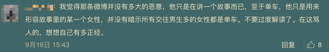 “只是形容故事裏的某一個女性,並沒有暗示所有的女性……在這兒罵人的,想想自己有多正經。”