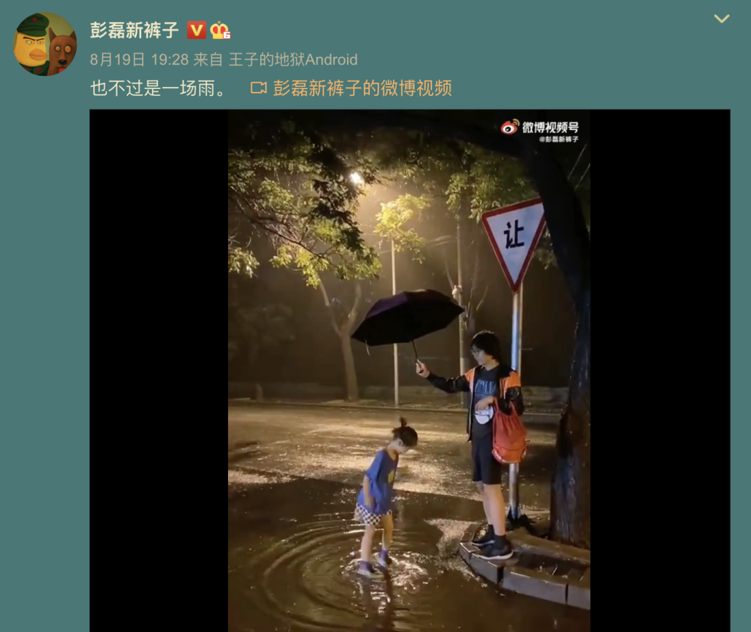 彭磊撐着雨傘一臉寵溺地看着女兒在街邊踩水玩,過後他發微博淡淡地寫道:“也不過是一場雨”。
