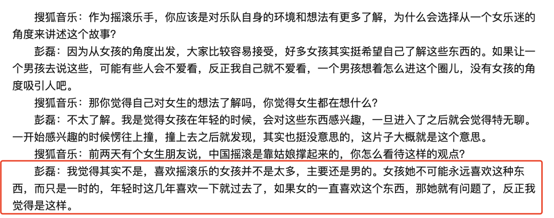 早年的一個採訪中,彭磊曾被問到:怎麼看“中國搖滾是靠姑娘撐起來的”這個觀點。