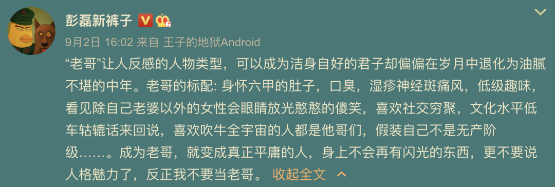 但你要説,彭磊是板上釘釘的“厭女”惡臭男吧,他對女性的輕蔑和歧視,似乎又是無法落到實處的。