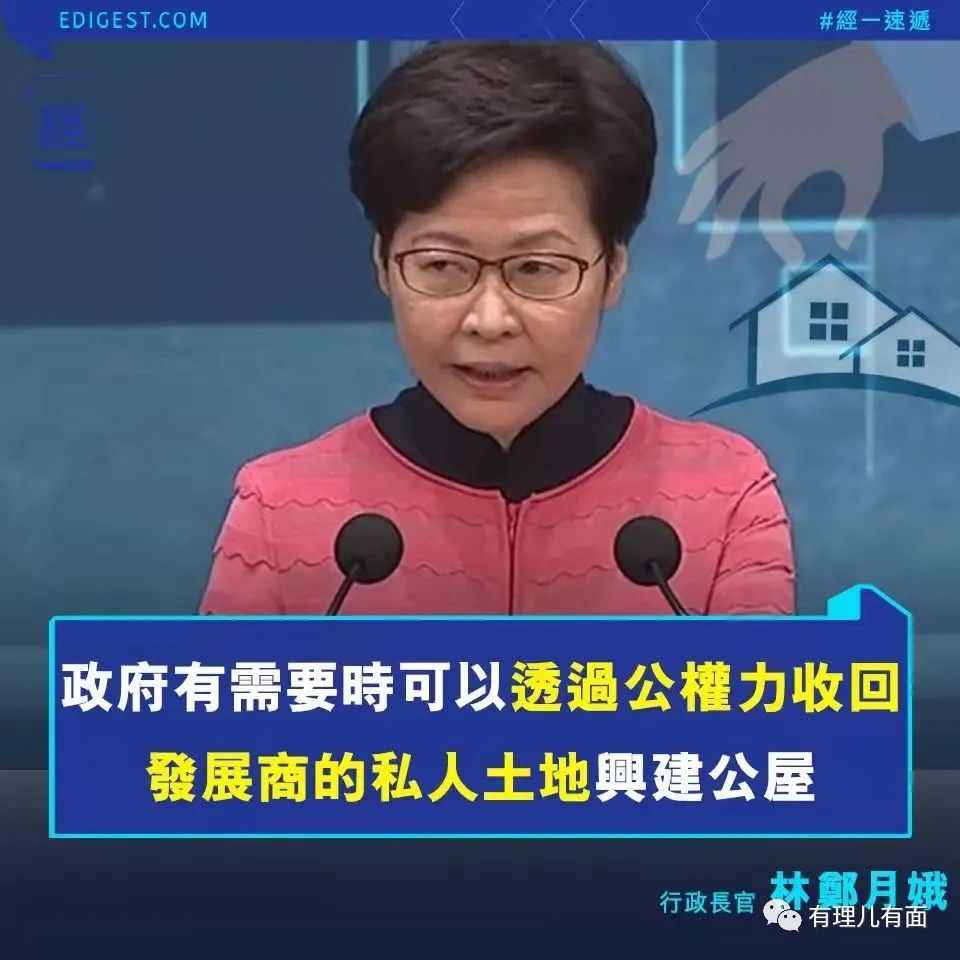 9月21日,在回覆路透社報道時,特首林鄭月娥明確指出:地產發展商所擁有的私人土地,政府在有需要時可運用公權力將土地收回,用作發展公營房屋。