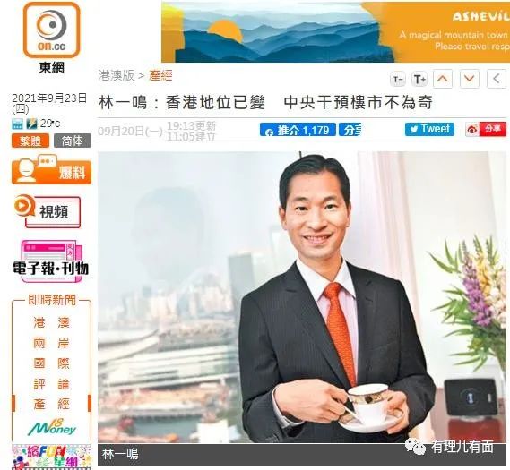20日,名義上是香港中文大學財務系哲學博士,事實上是地產資本代言人的林一鳴在港媒東網發表觀點,認為地產股20日大跌,很明顯是“遊戲規則已經改變”導致,認為中央在適當時候甚至會出手干預香港樓市。