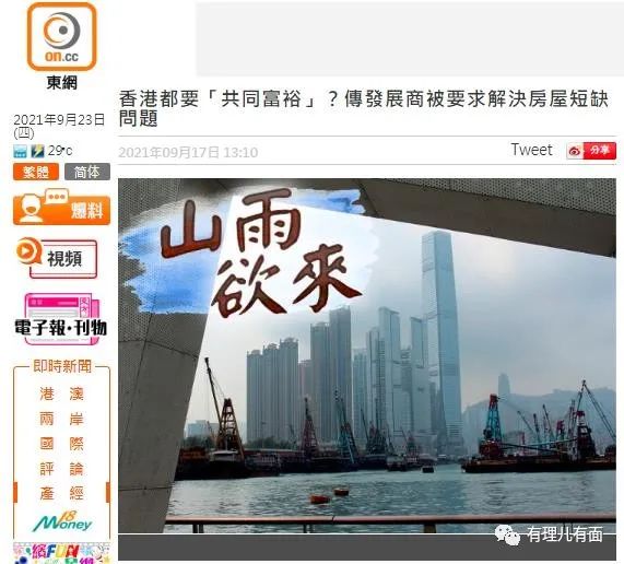 17日港媒東網就以“香港也要共同富裕”為題報道,並配上“山雨欲來”的配圖。