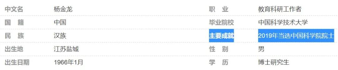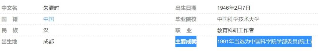 再來看我的兩位博士導師朱清時和楊金龍,百度百科上寫的他們的主要成就也分別是“1991年當選為中國科學院學部委員(院士)”和“2019年當選中國科學院院士”。
