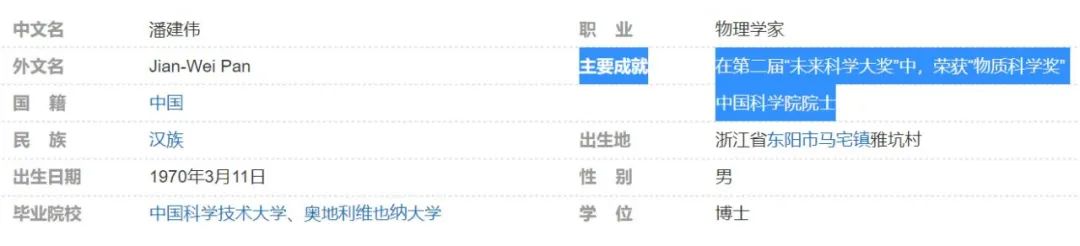 再來看一個,潘建偉的主要成就是什麼?百度百科寫的是“在第二屆未來科學大獎中,榮獲物質科學獎”以及“中國科學院院士”。