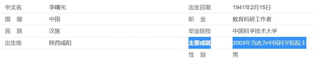 再來看我的前輩朋友、著名地質學家李曙光,百度百科上寫的他的主要成就是“2003年當選為中國科學院院士”。