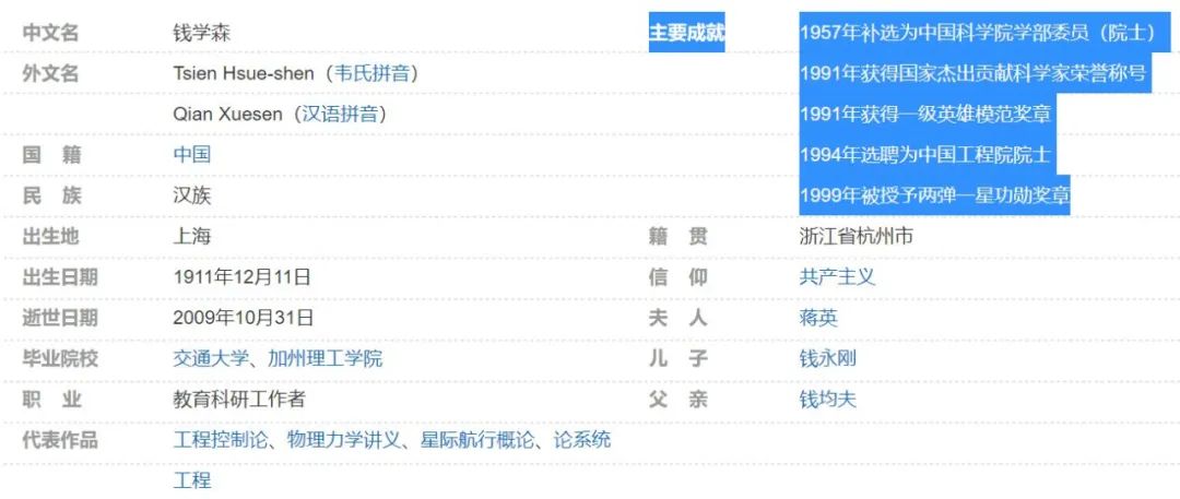 正常的回答應該是提出了工程控制論,領導了中國的兩彈一星計劃等等,對吧?可是你打開百度百科,看到裏面寫的他的主要成就卻是“1957年補選為中國科學院學部委員(院士),1991年獲得國家傑出貢獻科學家榮譽稱號,1991年獲得一級英雄模範獎章,1994年選聘為中國工程院院士,1999年被授予兩彈一星功勳獎章”。