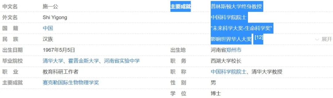 再來看著名生物學家施一公,百度百科上寫的他的主要成就是“普林斯頓大學終身教授、中國科學院院士、未來科學大獎-生命科學獎、影響世界華人大獎”。