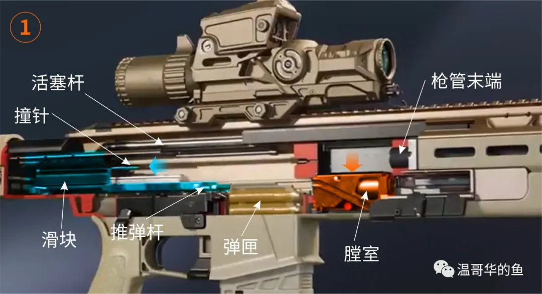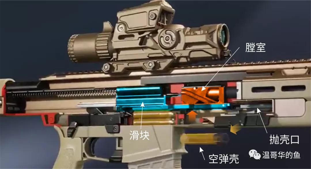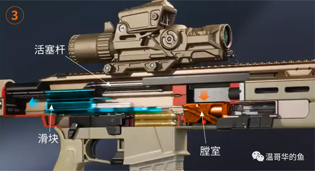 ③:子彈飛出槍膛的同時高温燃氣推動活塞向後敲擊活塞桿,後者帶動滑塊後坐,推彈杆驅動膛室帶着空彈殼一起下降。