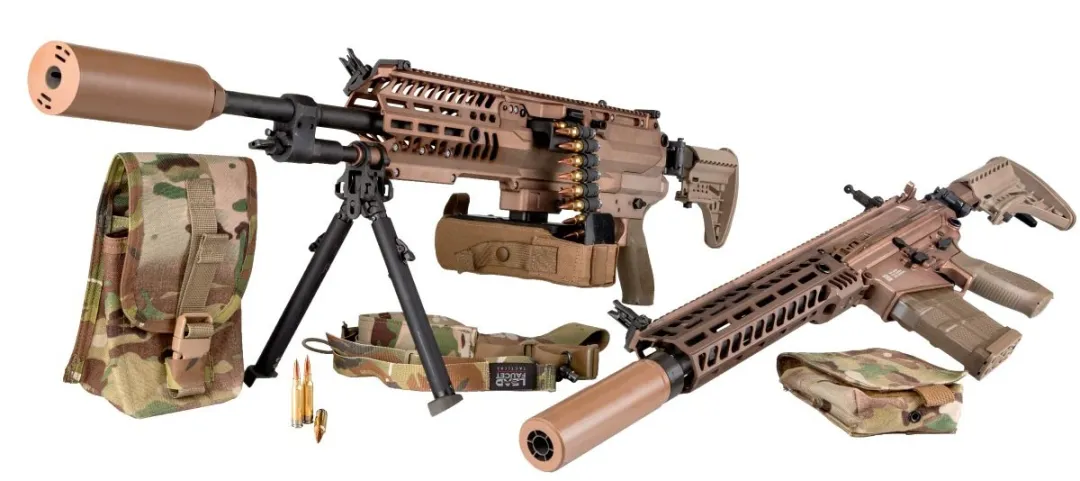 優秀的人機工效,三種新槍普遍使用了左右手都可操作的拉機柄和快慢機;聚合物20發彈匣可以很直觀地看到存彈量;兩種機槍都使用了可快速裝卸的織物彈袋,槍托可伸縮甚至同時還能摺疊;兩腳架結構堅固、撤收方便;槍身頂部配備全長皮軌,護木採用M-LOK系統,附件兼容性很強;標配的消聲器也減輕了槍口焰和噪音對射手的健康影響。另外三種新槍都採用了FDE(Flat dark earth)深土黃色外觀,不再使用傳統的黑色表面處理工藝,這也是一種新趨勢。