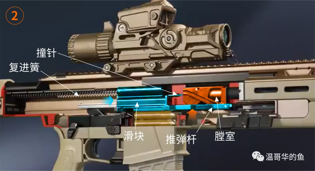 ②:鬆開拉機柄,滑塊在復進簧的推動下向前移動,推彈杆將首發彈從彈匣頂部推入膛室中,隨後繼續前進帶動膛室上升和槍管末端對齊。撞針穿過機匣後壁上的小孔擊發底火,子彈射出。