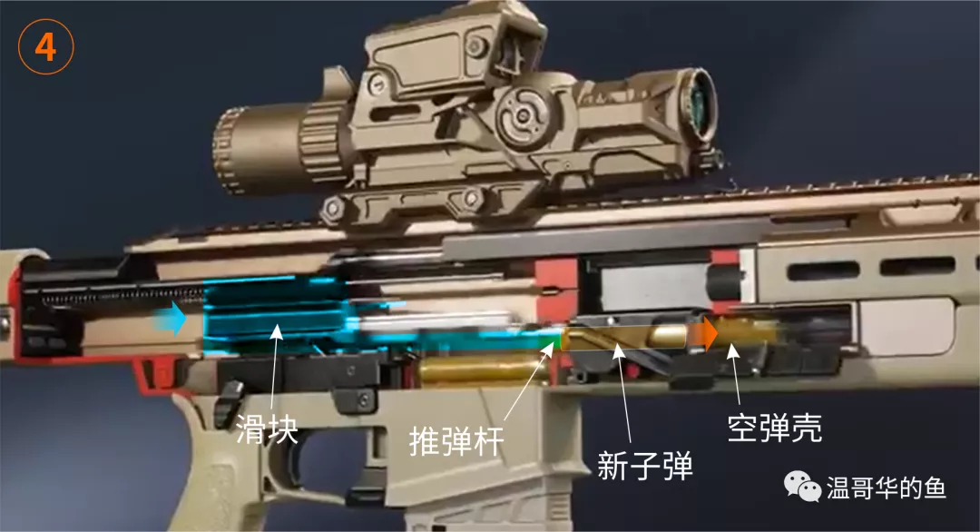 ④:滑塊復進時推彈杆將下一發子彈推入膛室,並將空單殼向前頂出,從右側拋殼口飛出,完成一個循環。