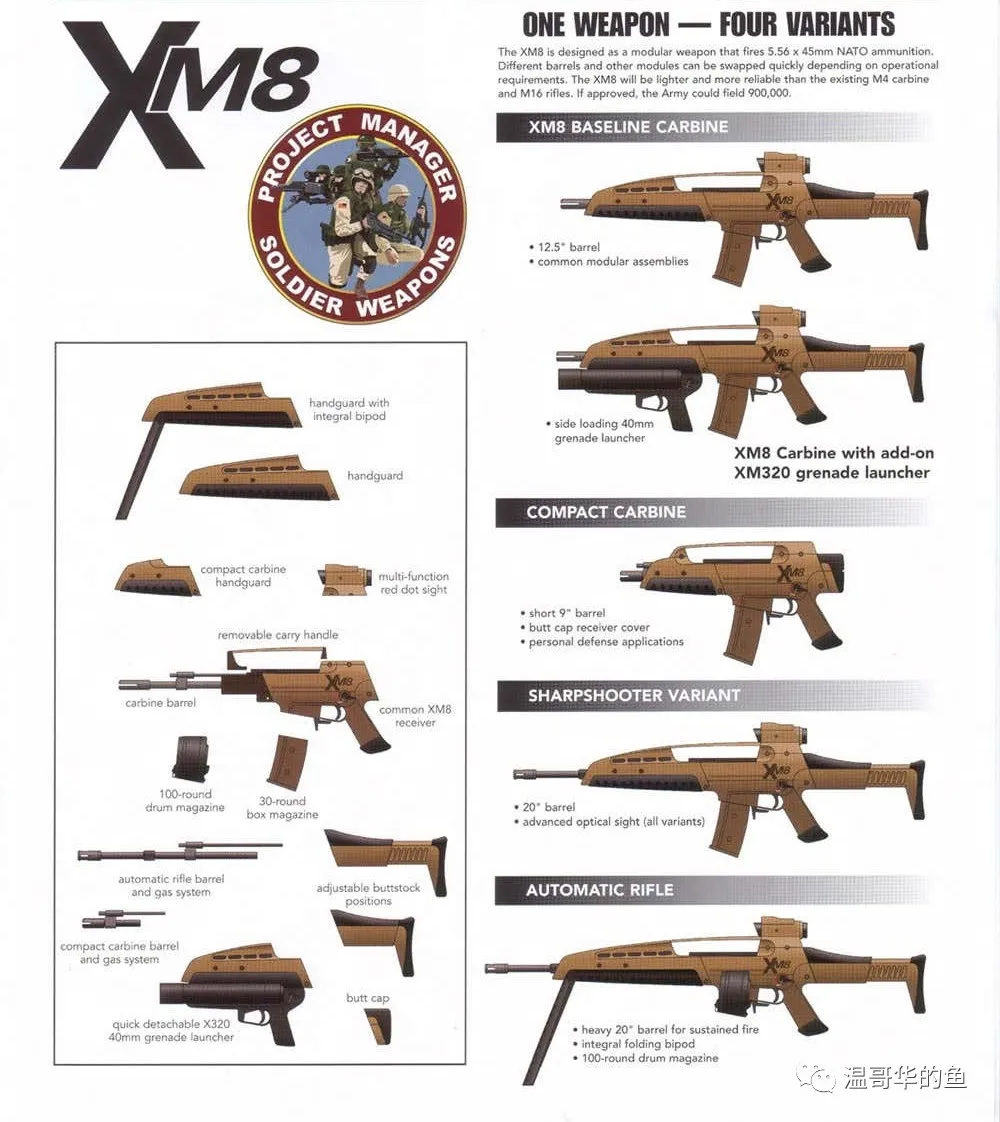 XM8部分採用了G36的設計和工藝,美國陸軍對交付的200多支樣槍進行測試後發現問題重重,包括觀瞄系統電池壽命太短、人體工程學問題、重量偏大(3.4公斤)、連續射擊產生的熱量會熔化護木等。因為國會不同意繼續投資,該項目在2005年10月被取消。