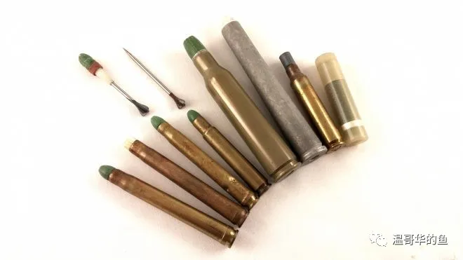 > 各種規格的5.6毫米SPIW備選箭型彈,頭部綠色的彈託在飛出槍口後就會脱落,和坦克的脱殼尾翼穩定穿甲彈一樣原理