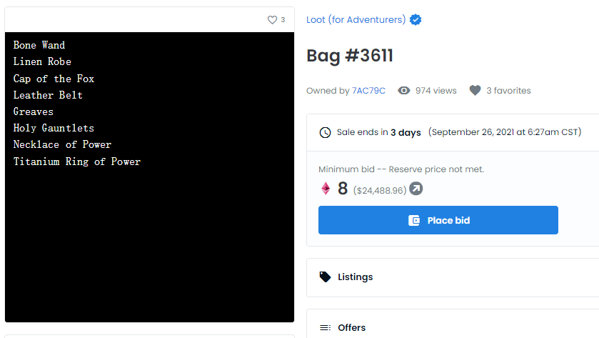 就拿這個售價約十多萬人民幣的 NFT 為例吧。黑色的背景,再加上 " 骨頭做的法杖 " 、 " 亞麻袍子 " 、 " 皮腰帶 " 等等的白字描述。。。