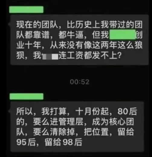 最近武漢一互聯網公司領導的一句“80後該退出IT行業”衝上熱搜,無疑再次將“中年危機”這個話題擺在了明面上。事情的起因是該公司一位中年銷售人員,在半夜發現自己被領導開除,感覺很不爽,便把領導在工作羣裏的發言曬在了網上。這位領導把近年公司經營困難的原因歸結於團隊成員都到了中年,沒有年輕人有幹勁,表示從10月起,80後要麼進管理層,要麼被清理掉,給95後、98後騰位置,還表示“見不得下了班要回家給老婆孩子做飯的男人”。