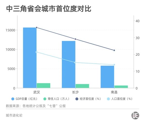 2020年,南昌GDP5745.51億元,僅相當於武漢的三分之一、長沙的一半;常住人口約為武漢的一半、長沙的三分之二;GDP和人口首位度也明顯落後。