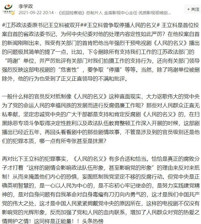 (《人民的名義》總監製在獲悉原省委政法委書記被雙開後發文稱:該書記當時就想讓《人民的名義》停播)