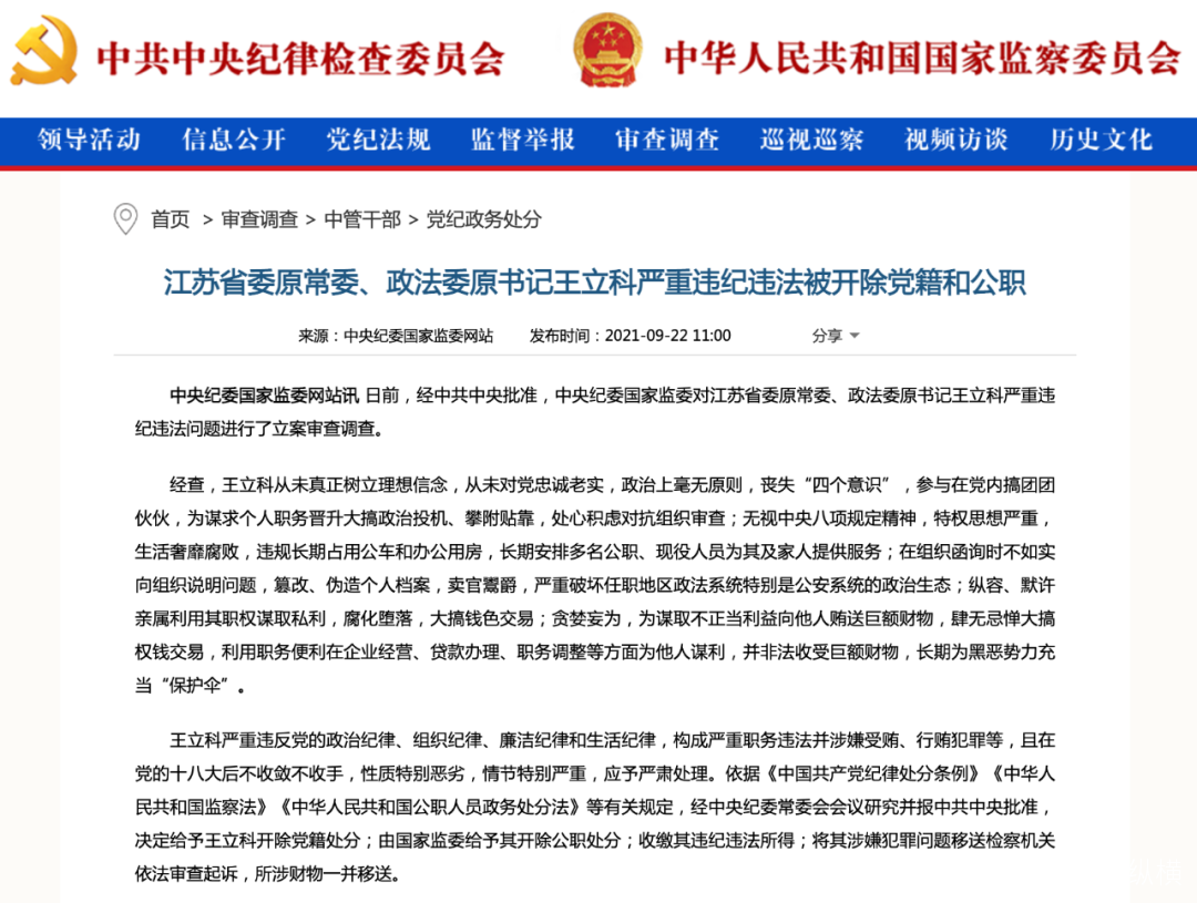 (2021年9月22日,去年10月主動投案的江蘇省委原常委、政法委書記被開除黨籍公職)
