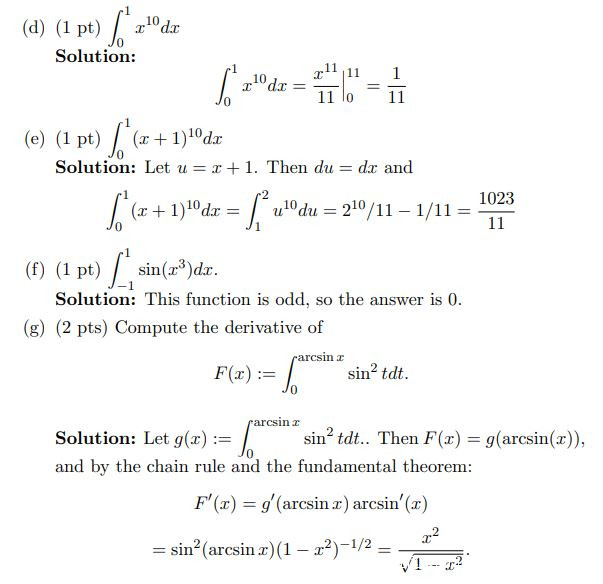 前面幾道都是基礎得不能再基礎的題。最後一個(g)小題看起來難一點也不難想到直接用基本定理即可得出。考慮到伯克利要再Math 1B才學習積分技巧,再看看Math 1B的期末考積分題。