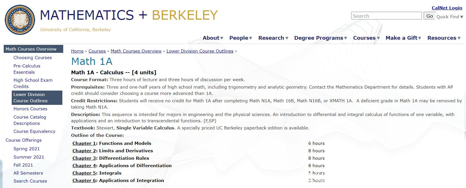 可以看到,這門課主要內容是一元函數微積分學,針對的學生是工程與物理科學類學生。如果通過了AP微積分考試的可以免修這一門課。但是這門課只講到了積分及其應用,而國內理工類大學高等數學(一)一般還會學積分技巧、級數、微分方程初步的內容。這些內容在伯克利是Math 1B這門課。