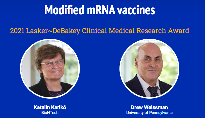 兩位mRNA領域的先驅卡里科和魏斯曼獲得拉斯克臨牀醫學研究獎。