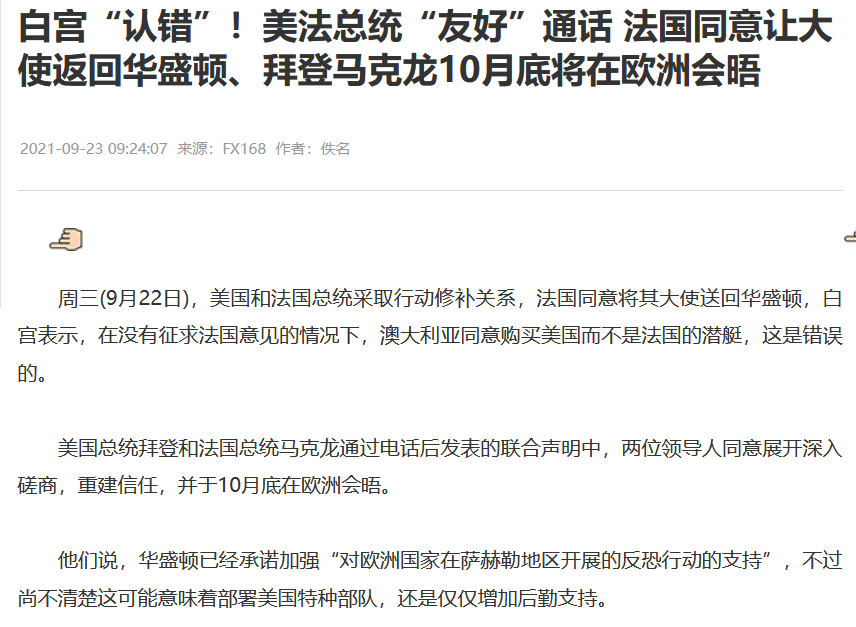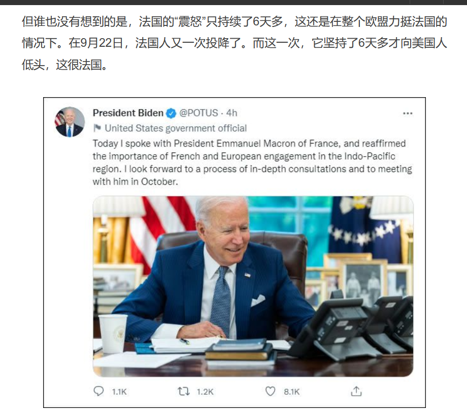 澳大利亞建造核潛艇是以撕毀和法國的900億澳元訂單作為代價。而法國一年的軍費也不到900億澳元。美英澳的這種做法無疑高度損害了法國的利益和麪子。自法國總統馬克龍以下,各路官員、前官員都紛紛發表評論,表示決不接受AUKUS聯盟的做法。法國直接召回了駐美國和澳大利亞的大使。當然,在與拜登通了電話之後,馬克龍又同意將把大使派了回去。一時之間,所謂的歐洲戰略自主再一次成為了眾人的笑話。從敍利亞到阿富汗再到AUKUS聯盟,大家不得不問,美國什麼時候會再打歐洲的臉呢。