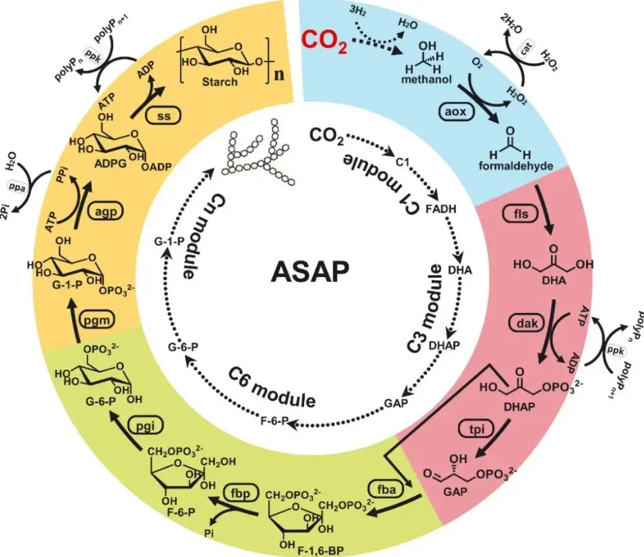 在該研究中,**天津工生所從頭設計出11步主反應的非自然二氧化碳固定與人工合成澱粉新途徑,在實驗室中首次實現從二氧化碳到澱粉分子的全合成。**研究團隊採用一種類似“搭積木”的方式,聯合中科院大連化學物理研究所,利用化學催化劑將高濃度二氧化碳在高密度氫能作用下還原成碳一(C1)化合物,然後通過設計構建碳一聚合新酶,依據化學聚糖反應原理將碳一化合物聚合成碳三(C3)化合物,最後通過生物途徑優化,將碳三化合物聚合成碳六(C6)化合物,再進一步合成直鏈和支鏈澱粉(Cn化合物)。