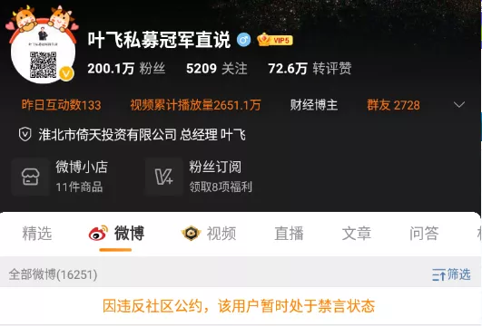 微博上,名為“葉飛私募冠軍直説”的微博號,其最後一條微博停留在8月9日。