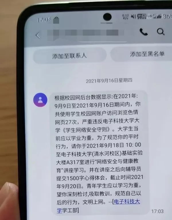 9月23日,一條署名為電子科技大學學工部的短信在社交網絡廣泛流傳,短信中稱,根據校園網後台數據顯示,某同學共使用學生校園網賬户訪問瀏覽色情網頁27次,嚴重違反電子科技大學大學生《學生網絡安全準則》,要求該學生進行“網絡安全與健康教育”講座學習,並在講座之後向輔導員提交1500字心得體會。