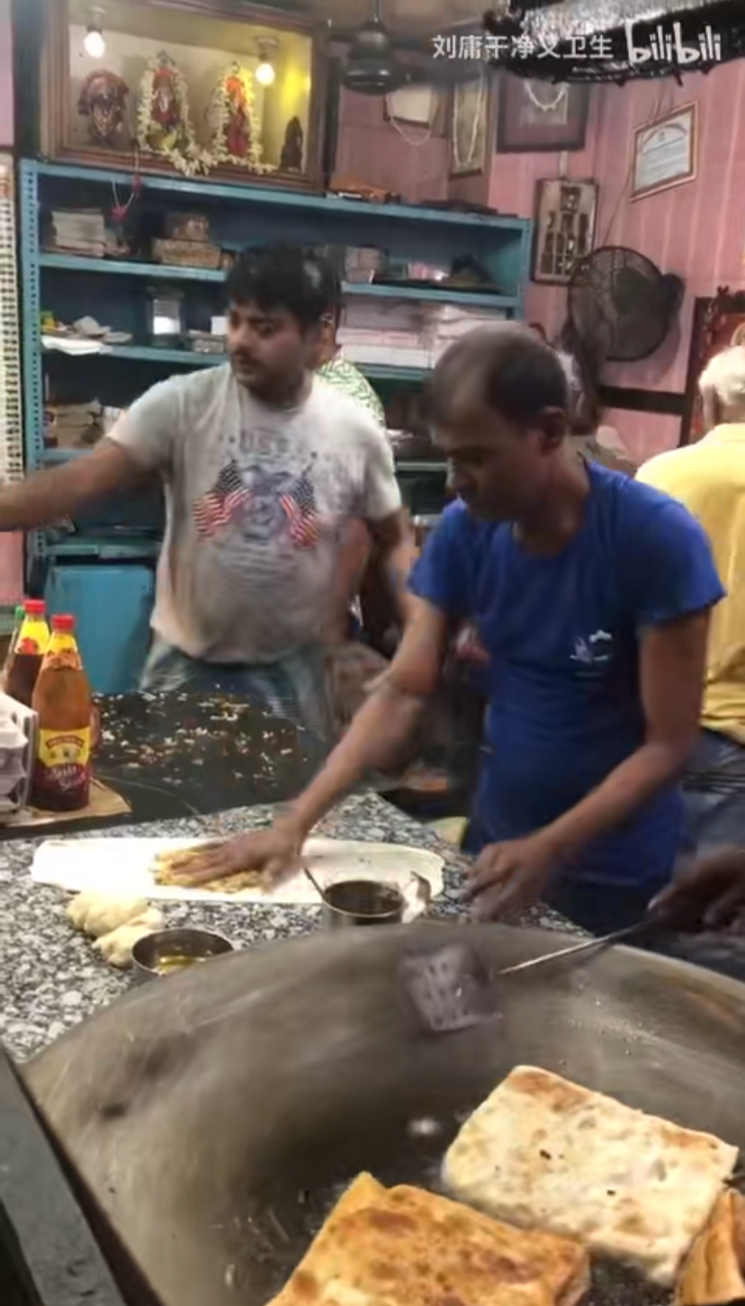 鏡頭裏,鍋內是油炸至金黃蓬鬆的餅,旁邊是印度小哥,正麻溜地把雞蛋敲到生麪糰上。下一秒,小哥掏出一個裝有不明糊狀物的不鏽鋼杯子,把整杯東西倒了下來,然後,他熟練地用自己的手抹了上去。