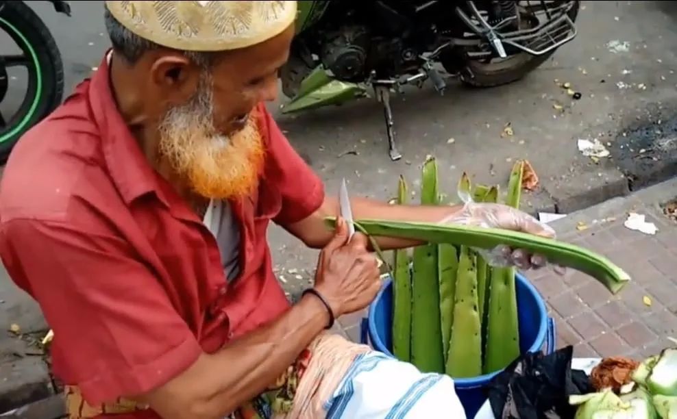 這些印度美食以其獨特的做法震驚了屏幕前的觀眾。就拿蘆薈汁這類印度小吃來説,它不像橙汁等飲料一樣單純的把水果榨成汁,也沒有大家印象中蘆薈酸奶裏Q彈果粒的口感,而是在手工刮出蘆薈汁的同時,加入了黑孜然、車前子殼等諸多詭異的材料。