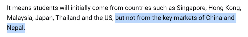 這意味着學生最初將來自新加坡、香港、馬來西亞、日本、泰國和美國等地區,但不會來自中國大陸和尼泊爾等關鍵市場。
