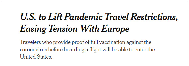 在實施為期18個月的禁令後,美國將於11月重新開放,允許“完全接種新冠疫苗”(fully vaccinated)的外國人入境。美國疾控中心(CDC)發言人稱,所有接種了獲得世界衞生組織緊急使用認證的疫苗的人,均將視為“完全接種”。