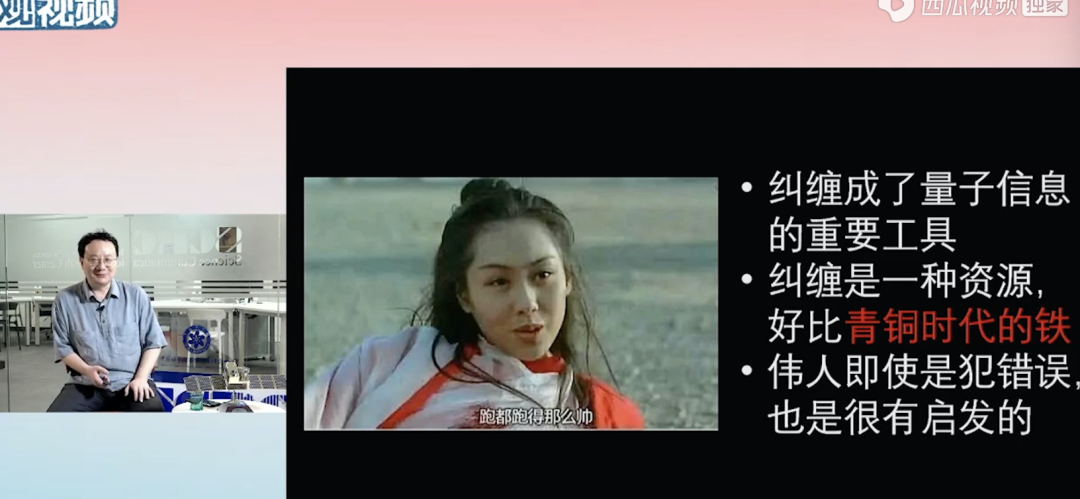 愛因斯坦他在這個量子糾纏上面其實是犯了一個錯誤,但是即使是犯錯誤也是對我們很有啓發,就像大話西遊裏面紫霞仙子説的,跑都跑得這麼帥,我真幸福。
