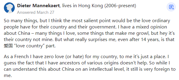 作為一個法國人,我對我的國家沒有任何愛(或恨),對我來説,它只是一個地方而已。我有各種各樣的祖先這一事實對我來説並沒有什麼幫助。因此,雖然我可以在知識層面上理解中國的這一點,但對我來説,這仍然是非常陌生的。
