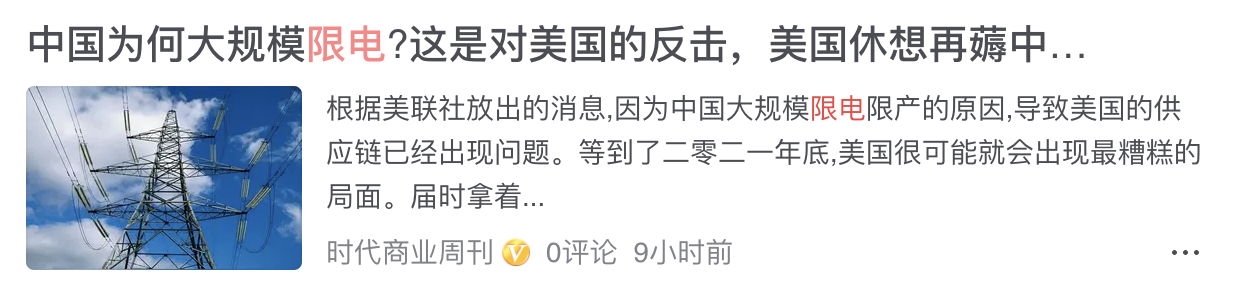 消費日報社旗下賬號時代商業週刊表示,中國限電是對美國的反擊,美國休想再薅我們的羊毛。