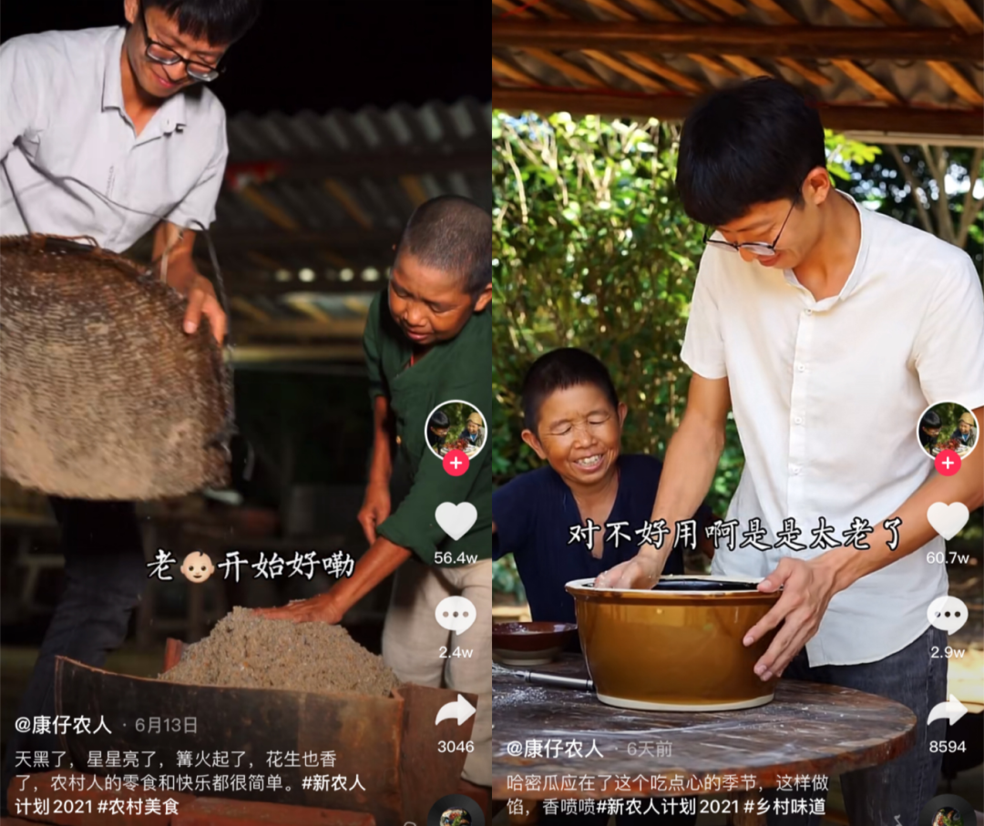 他們的視頻非常受00後的喜愛,讓從小生活在城市、在電子產品陪伴下長大的孩子,認識農村生活,同時也喚起了他們對自己爺爺奶奶的思念。這些“銀髮網紅”身子硬朗,心態年輕,經常做一些創新菜,比如“西瓜龍蝦、披薩奶茶”。這種“反差萌”也為她們吸引了與上述達人不同年齡層的粉絲。