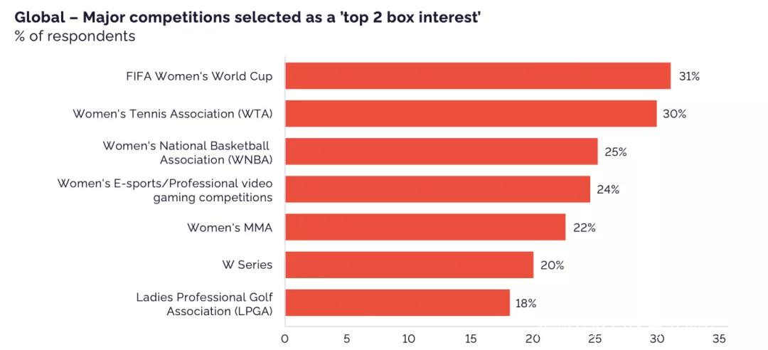 在全球範圍內,作為「世界第一運動」的足球,同樣是最受關注度的女性體育項目。全球最具有號召力的女性體育大型賽事是FIFA女足世界盃,其次則是網球和籃球的各項賽事。而近年來突飛猛進的女子電競,也在TOP榜單佔據了一席之地,僅次於足/網/籃三大傳統項目。