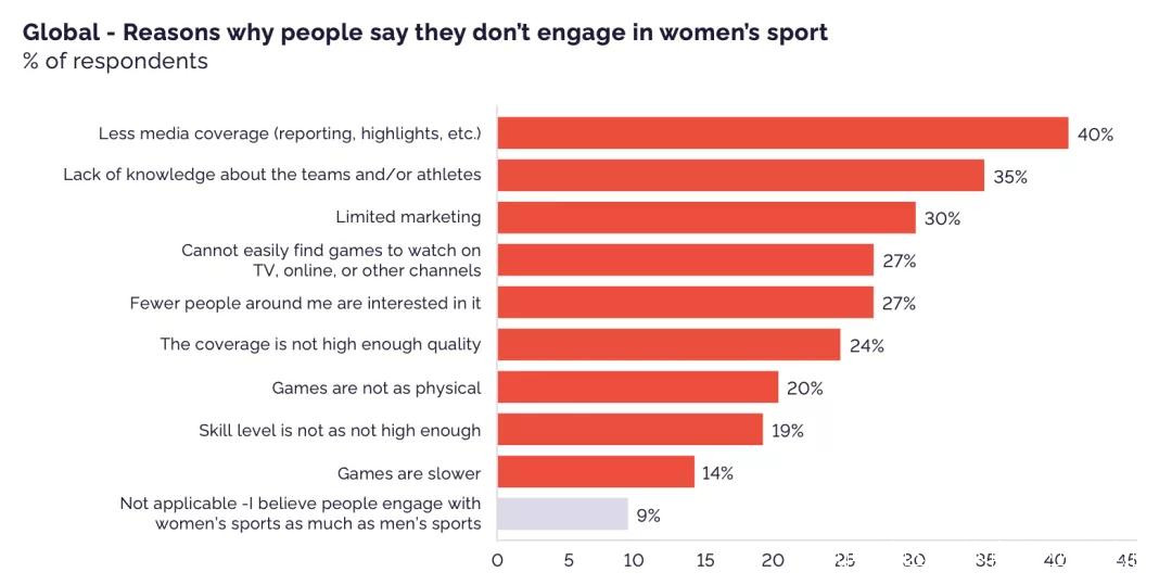 在調查中,40%的受訪者認為,相對於薪酬、商業贊助和政策等方面的因素,媒體對於女子體育的主動關注度不足,仍是導致女子體育不受關注的最主要體現。畢竟,下降的社會關注度,反過來又會對媒體關注度造成負面效果,造成惡性循環。