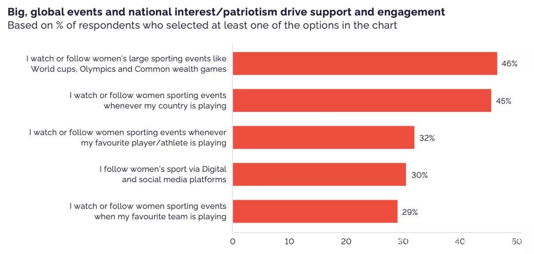 根據YouGov的報告,大型國際賽事的舉行,依舊是推動人們關注並參與女性體育的主要因素。
