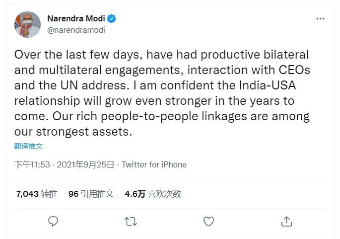 9月25日,印度總理納倫德拉·莫迪結束了為期3天的訪美行程。返回印度後,莫迪發推説:“這幾天裏,我與多國元首進行了富有成效的雙邊或多邊會晤,並進行了聯合國演講。我相信,在未來,印美關係將會更加穩固。兩國人民之間緊密的聯繫將成為我們共同的財富。”