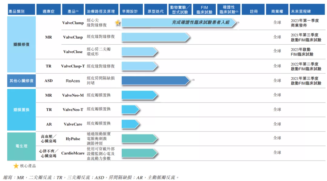 捍宇醫療的核心產品為ValveClamp,它主要適用於治療二尖瓣返流病變的原發性和繼發性的二尖瓣瓣葉修復手術。據招股書,該產品已於2021年3月完成註冊臨牀試驗的全部病例入組,預計2022年第一季度可完成全部的出組和隨訪,2023年一季度實現上市。