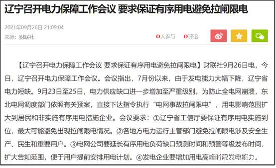 這裏已經提到“7月份以來,由於發電能力大幅下降,遼寧省電力短缺。9月23日至25日,電力供應缺口進一步增加至嚴重級別。為防止全電網崩潰,東北電網調度部門依照有關預案,直接下達指令執行“電網事故拉閘限電”,用電影響範圍擴大到居民和非實施有序用電措施企業。”