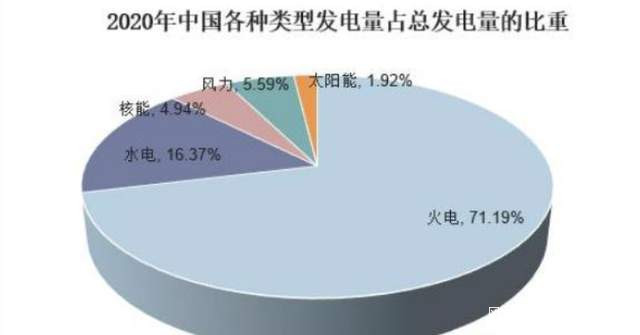 2020年我國各類發電的佔比,火力發電仍然佔比71.19%,相比前幾年的76%,已經下降了5%左右。